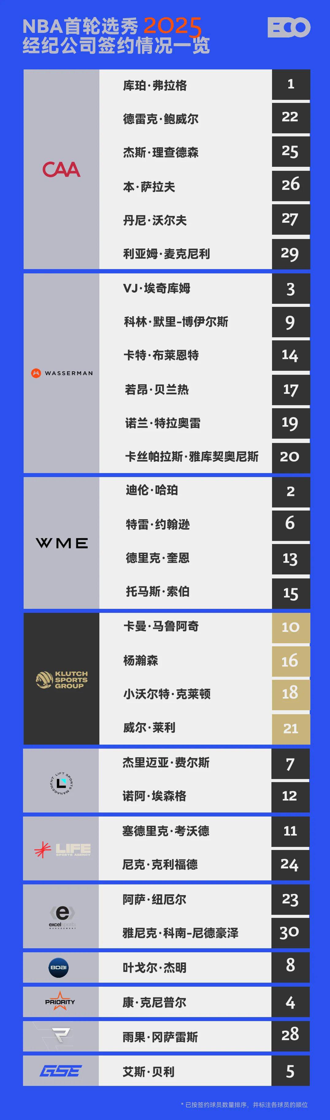 值得一提的是,虽然Klutch在整体签约数量上仍落后于CAA和Wasserman,但在个人经纪人层面,里奇·保罗已与WME的比尔·达菲并列,成为本届选秀代表首轮球员最多的经纪人。